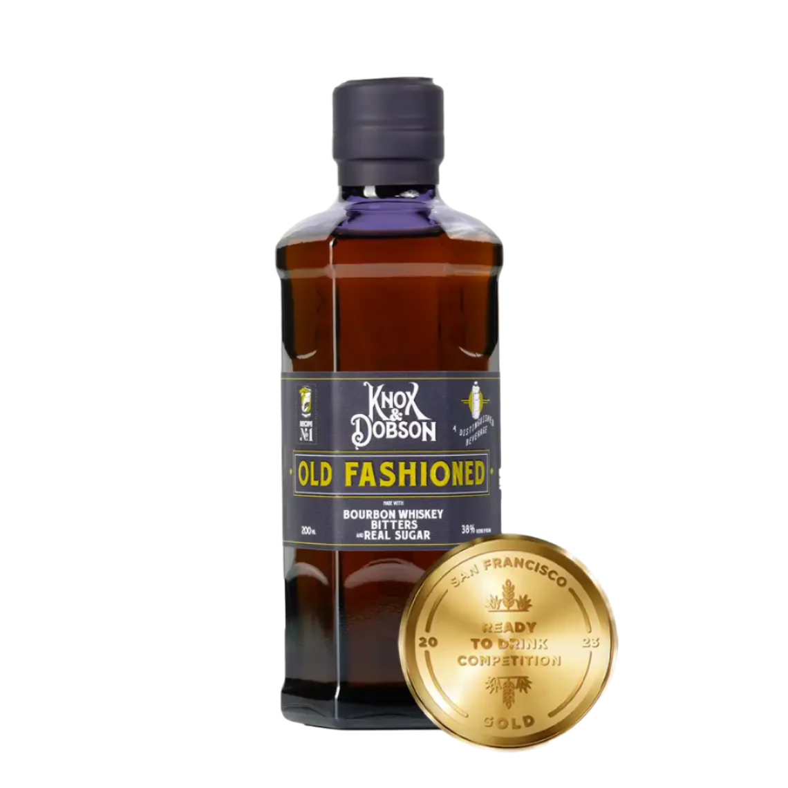 The Knox & Dobson Old Fashioned ready-to-drink cocktail features straight-aged bourbon, natural cane sugar, orange oil, and Angostura bitters.